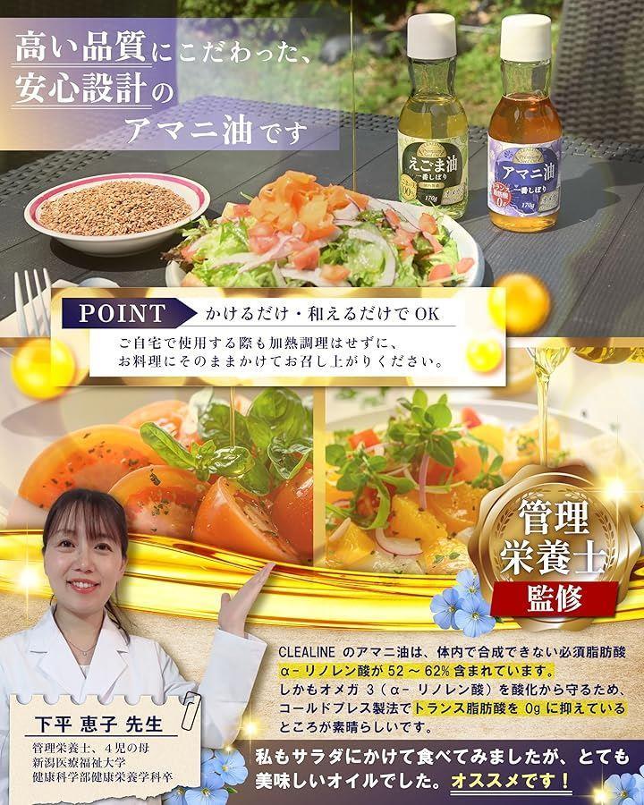 CLEALINEのアマニ油は、必須脂肪酸であるオメガ3脂肪酸(α-リノレン酸)を100gあたり52-62g含みます。