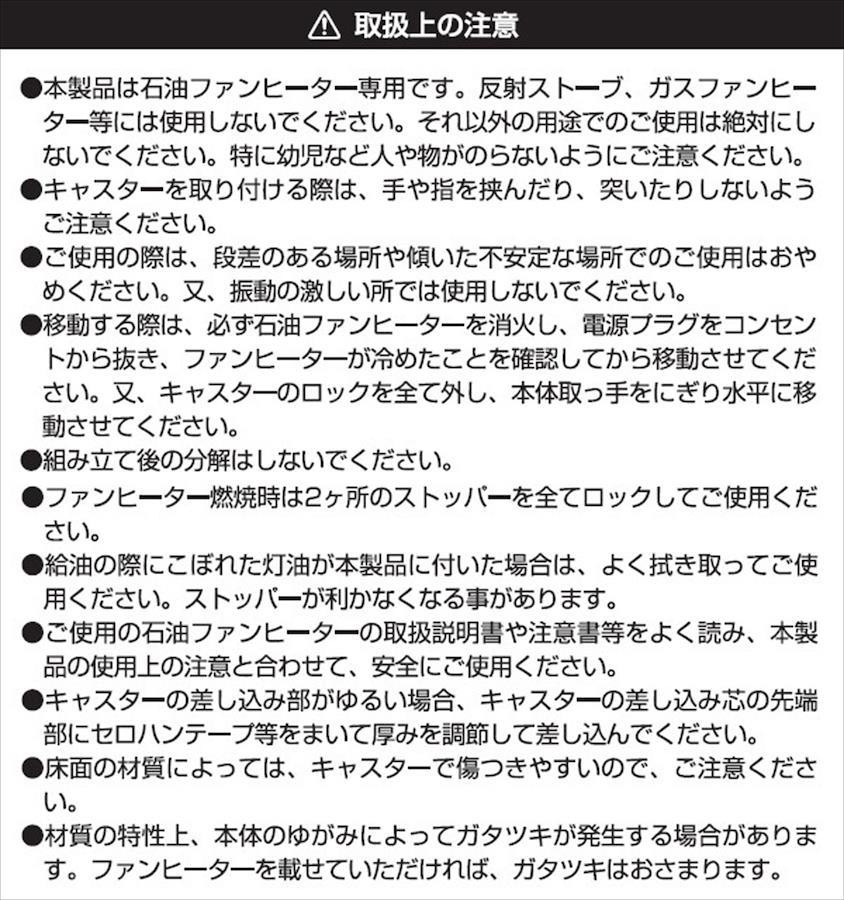 3営業日以内に発送≪新品未開封品≫:●石油ファンヒーター用ラックbr>●キャスター付で移動ができるお手軽ヒーター台●押入れやクローゼットからの出し入れが楽になるお助けグッズ●※石油ストーブ、ガスファンヒーター等での使用は不可●キャスター5個(うちストッパー付2個)