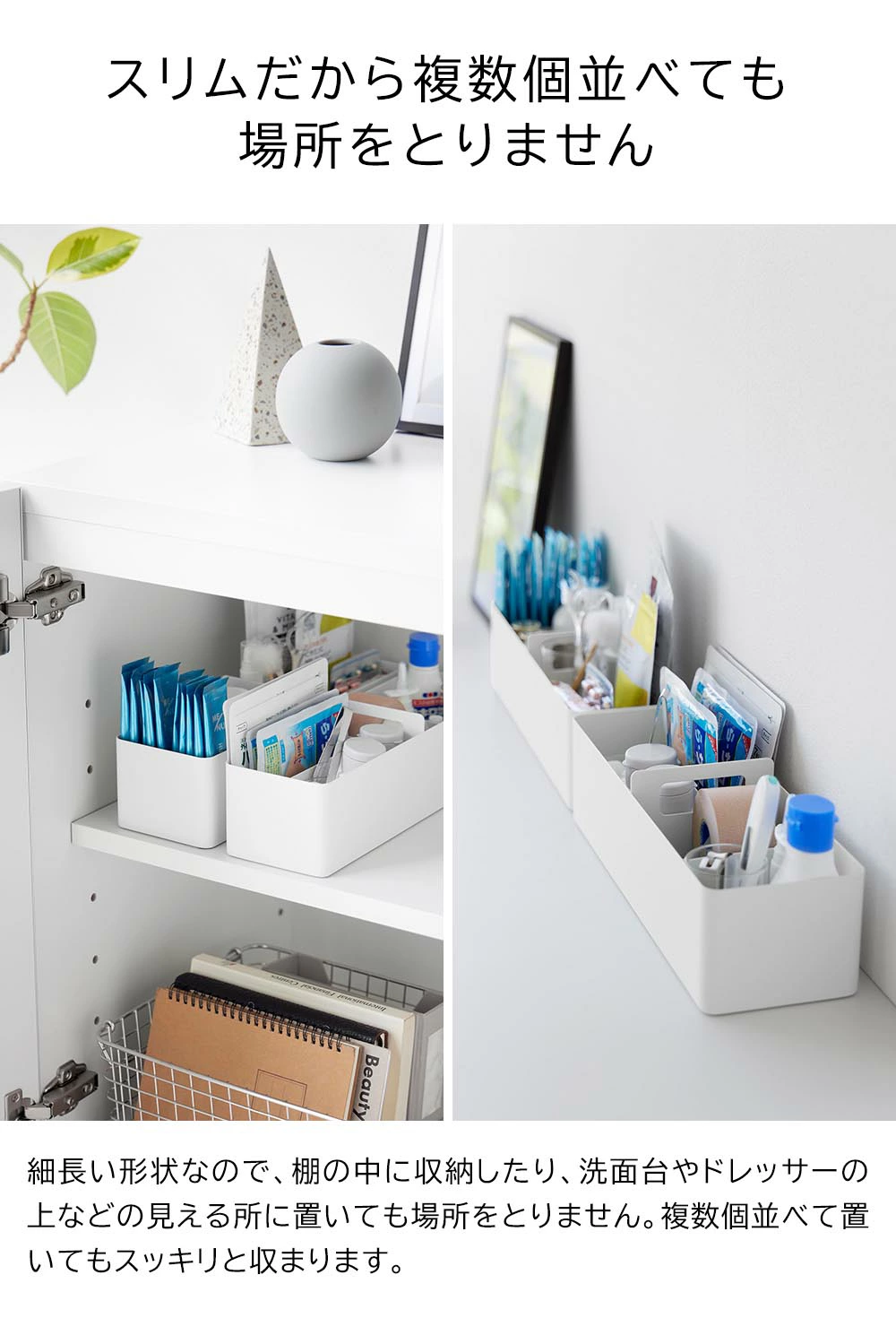 【ハンドル付きスリム収納ボックス】小物の収納に便利な、ハンドル付きのスリムなボックス。マグネット付きの可動式仕切りは、自由に仕切ることができるので小物やシートマスク、湿布なども収納しやすく便利。薬や衛生用品、メイク用品などの持ち運びしたいアイテム収納に便利です。2個使用して、基礎化粧品とメイクアップ用品を分けて収納するのも便利です。スリムなので戸棚に並べて置いても場所をとりません。