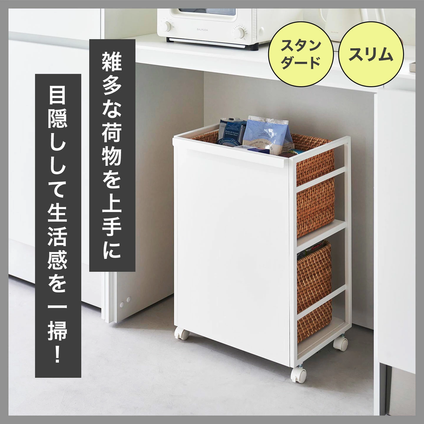 【目隠しワゴン スリム】かさばる大きな物を目隠ししながら一括収納!食品類やペット用品、お子様の学用品まで様々な物をストックできるスリムワゴン。使わない時は裏返すことで収納物を目隠しできます。調味料のストックやかさばる大きな食品類を一括収納。備蓄食品やプロテイン等の健康食品の収納やペットシート、おもちゃ、ペットフードなどのペット用品の収納にもおすすめです。ランドセルや教材類などお子様の学用品の収納にも。頑丈なキャスターと取っ手付きなので移動もラクラク。可動棚板は収納物の高さに合わせて調節可能です。