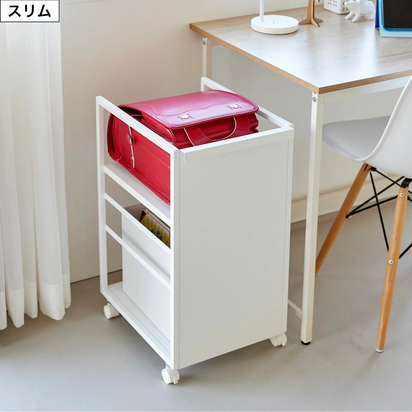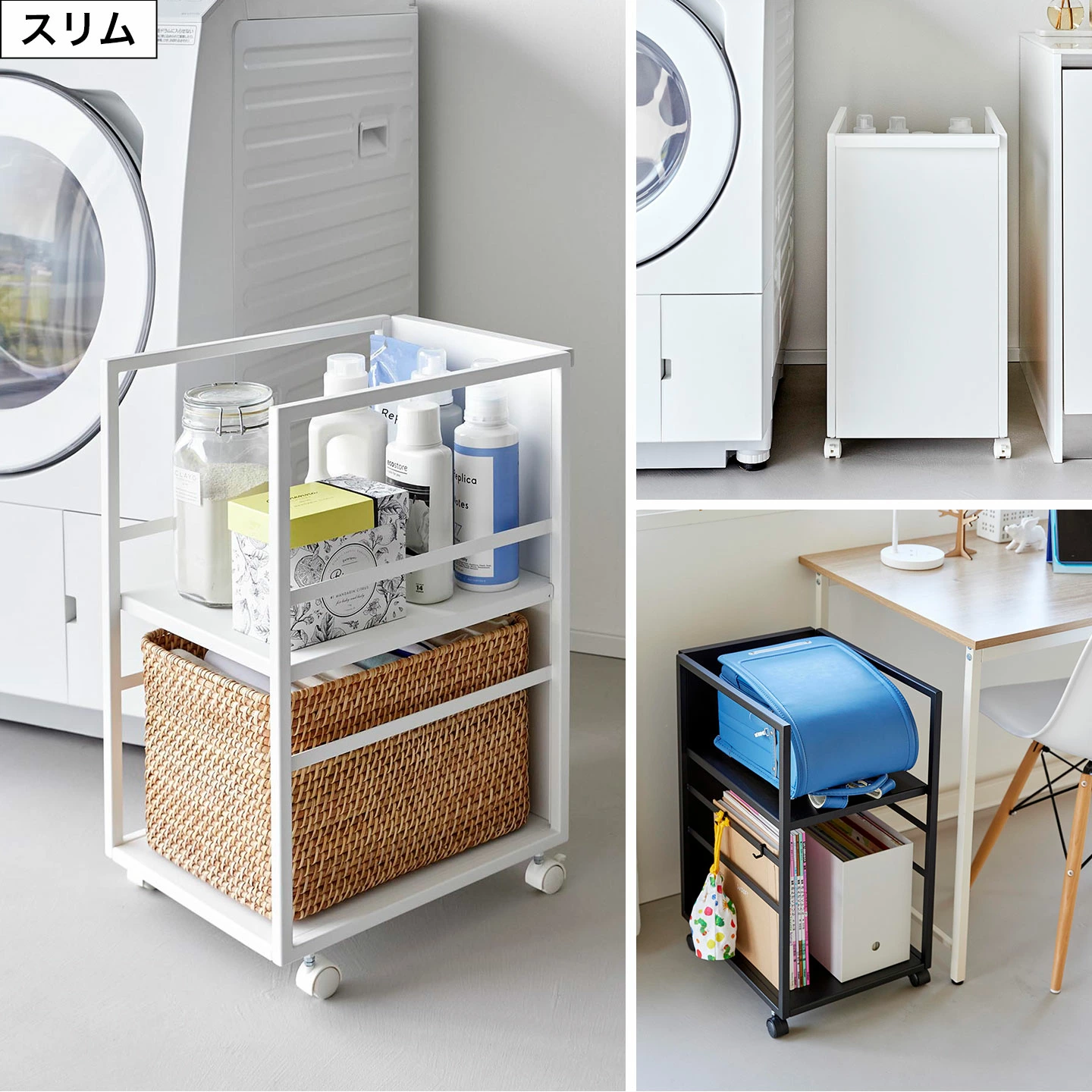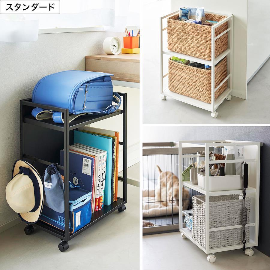 【目隠しワゴン】かさばる大きな物を目隠ししながら一括収納!食品類やペット用品、お子様の学用品まで様々な物をストックできるワゴン。使わない時は裏返すことで収納物を目隠しできます。調味料のストックなどかさばる大きな食品類を一括収納。備蓄食品の収納に。プロテイン等健康食品の収納に。ペットシートやおもちゃ、ペットフードなどのペット用品の収納に。ランドセルや教材類などお子様の学用品の収納にも。頑丈なキャスターで移動もラクラク。カウンター下やデスク下にもおすすめです。取っ手付きなので、移動も簡単。上段の可動棚板は2段階で高さ調節可能。