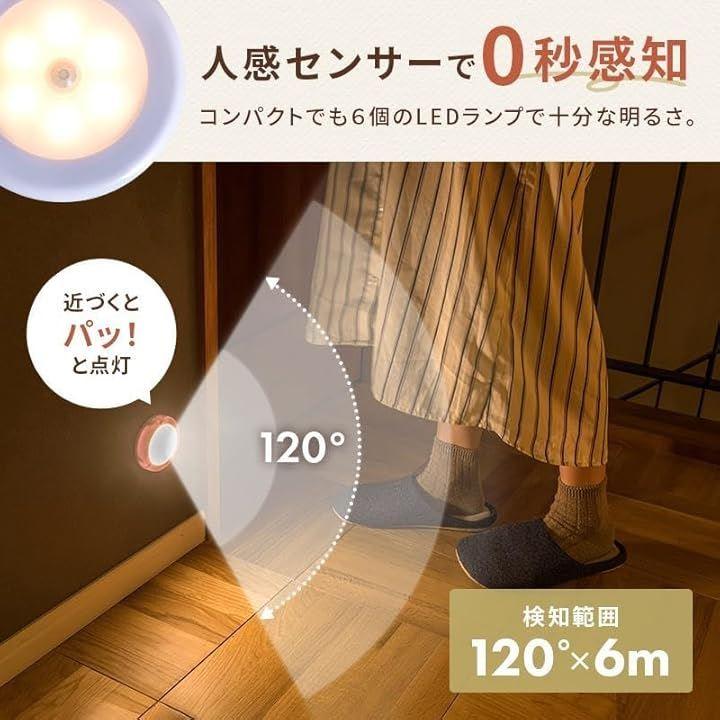 「商品仕様」 サイズ:約直径8cmx厚さ2cm/搭載LED:6灯/動作:人感センサー*周囲が暗い場合のみ。