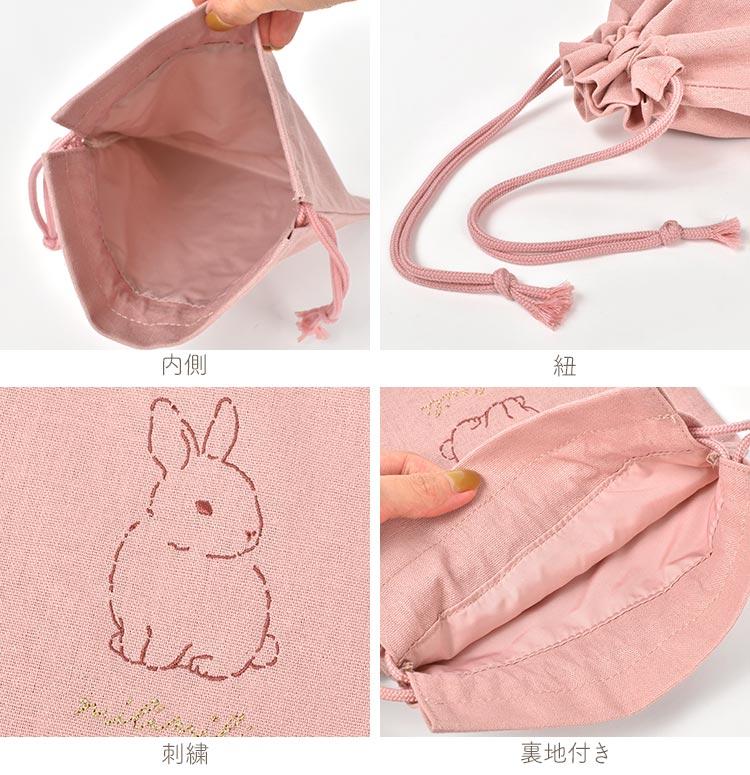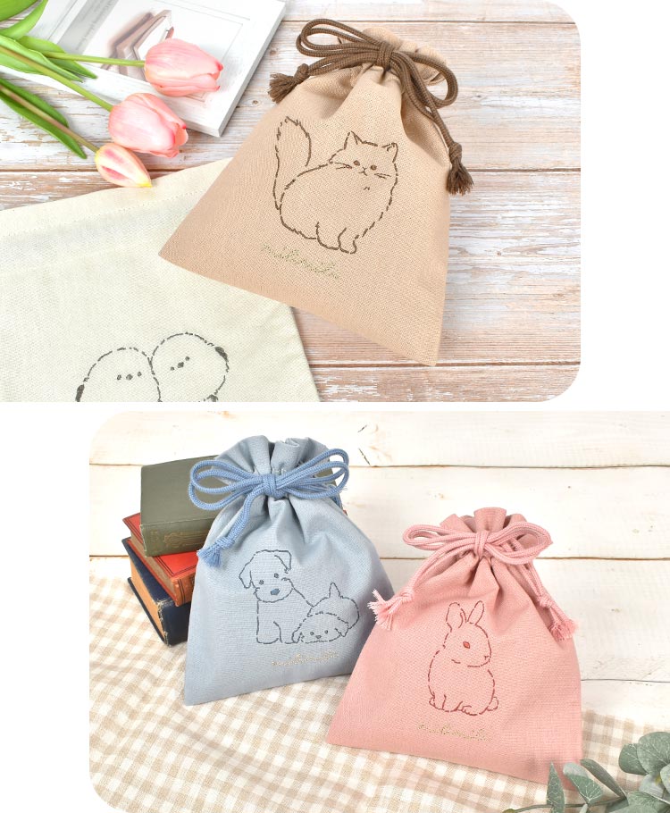 【巾着】落ち着いたくすみカラーと動物の刺繍がかわいい巾着ポーチ。メイク用品やお菓子など、バッグの中で散らばる小物を整理するのに便利◎大きすぎず小さすぎない持ち歩きやすいサイズ感でデイリー使いにぴったりです♪