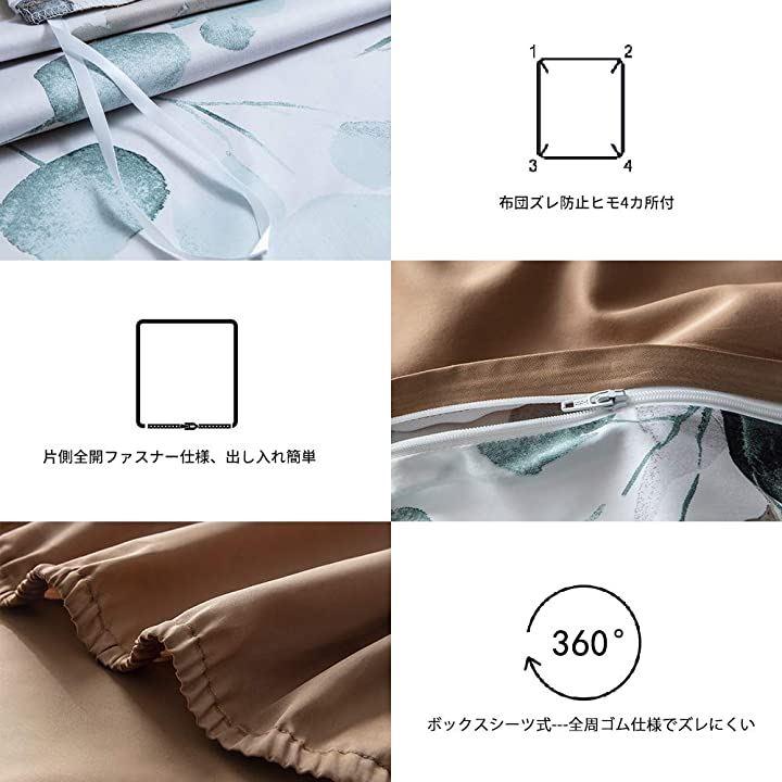 ・「デザイン」(1)掛布団カバー:片側全開ファスナー仕様--出し入れ簡単(2)掛布団カバー:ヒモ4カ所付--布団ズレ防止(3)枕カバー:合わせ式--出し入れ簡単