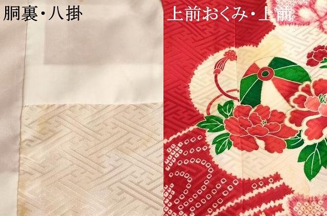 産着【正絹】の状態は接写画像のように胴裏・八掛・上前おくみ・上前に汚れがございますが