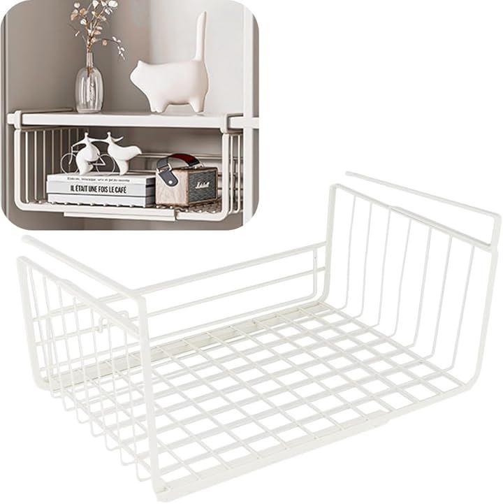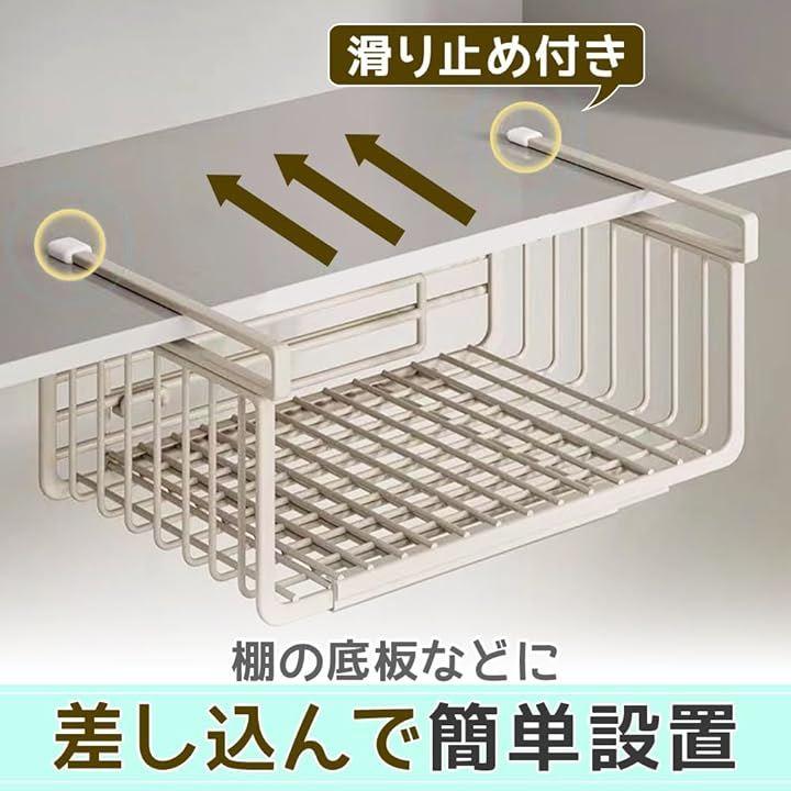 「セット内容」戸棚下用吊り下げラックx1点 「サイズ(約)」横幅:36cm~60cm 奥行:24cm 高さ:18cm 「棚板の厚さ(約)」2.5cmまで対応 「カラー」クリームホワイト 「材質」金属