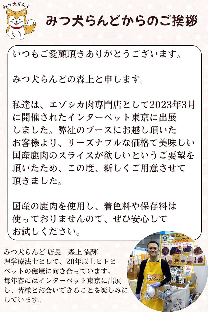 兵庫県播州で育った天然の脂身をカットした二ホンジカ肉100%を使用