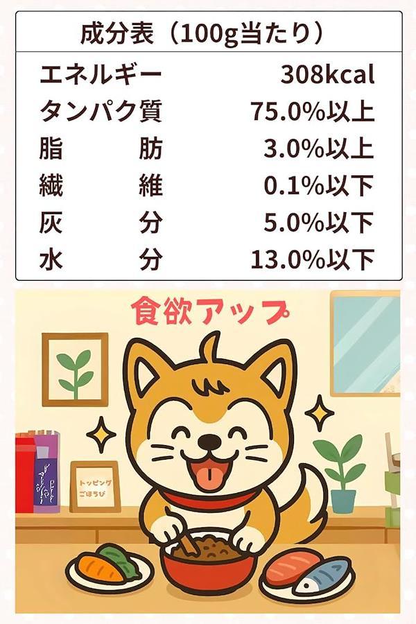 エネルギー308kcal タンパク質75.0%以上 脂肪3.0%以上 繊維 0.1%以下 灰分5.0%以下 水分13.0%以下