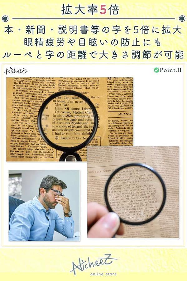 「拡大率5倍」本・新聞・辞書・説明書等の細かい文字を5倍の大きさに拡大できるレンズです。