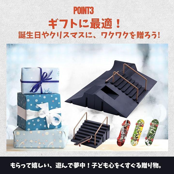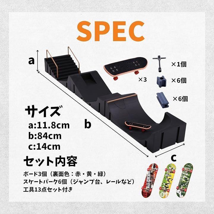 ・ボードサイズ:約9.9cm x 2.9cm 2cm ・セット内容:スケートパーク6種、フィンガースケートボードx3、コネクトツール13点 ・対象年齢:15歳以上 ・素材:ABSプラスチック、合金パーツ