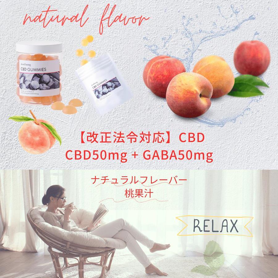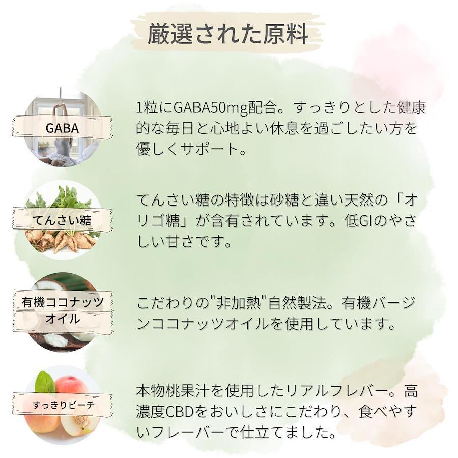 ・原材料名/水飴(国内製造)、てんさい糖、ゼラチン、もも濃縮果汁、有機ココナッツオイル、GABA、カンナビジオール、粉末オブラート、澱粉/ソルビトール、酸味料(クエン酸)、香料、乳化剤、野菜色素、光沢剤、(一部に大豆を含む)
