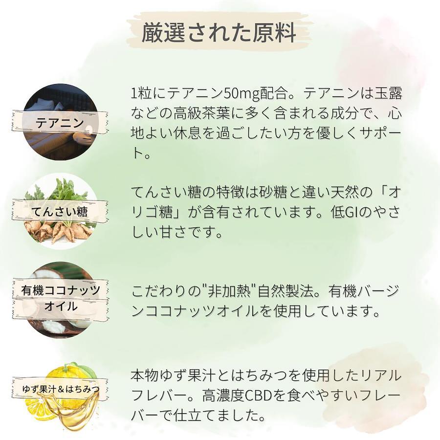 ・原材料名/水飴(国内製造)、てんさい糖、ゼラチン、イソマルトオリゴ糖、ゆず果汁、はちみつ、有機ココナッツオイル、テアニン、調味料(有機酸)、カンナビジオール、粉末オブラート、澱粉/ソルビトール、酸味料(クエン酸)、香料、乳化剤、野菜色素、光沢剤、(一部にゼラチン大豆を含む)