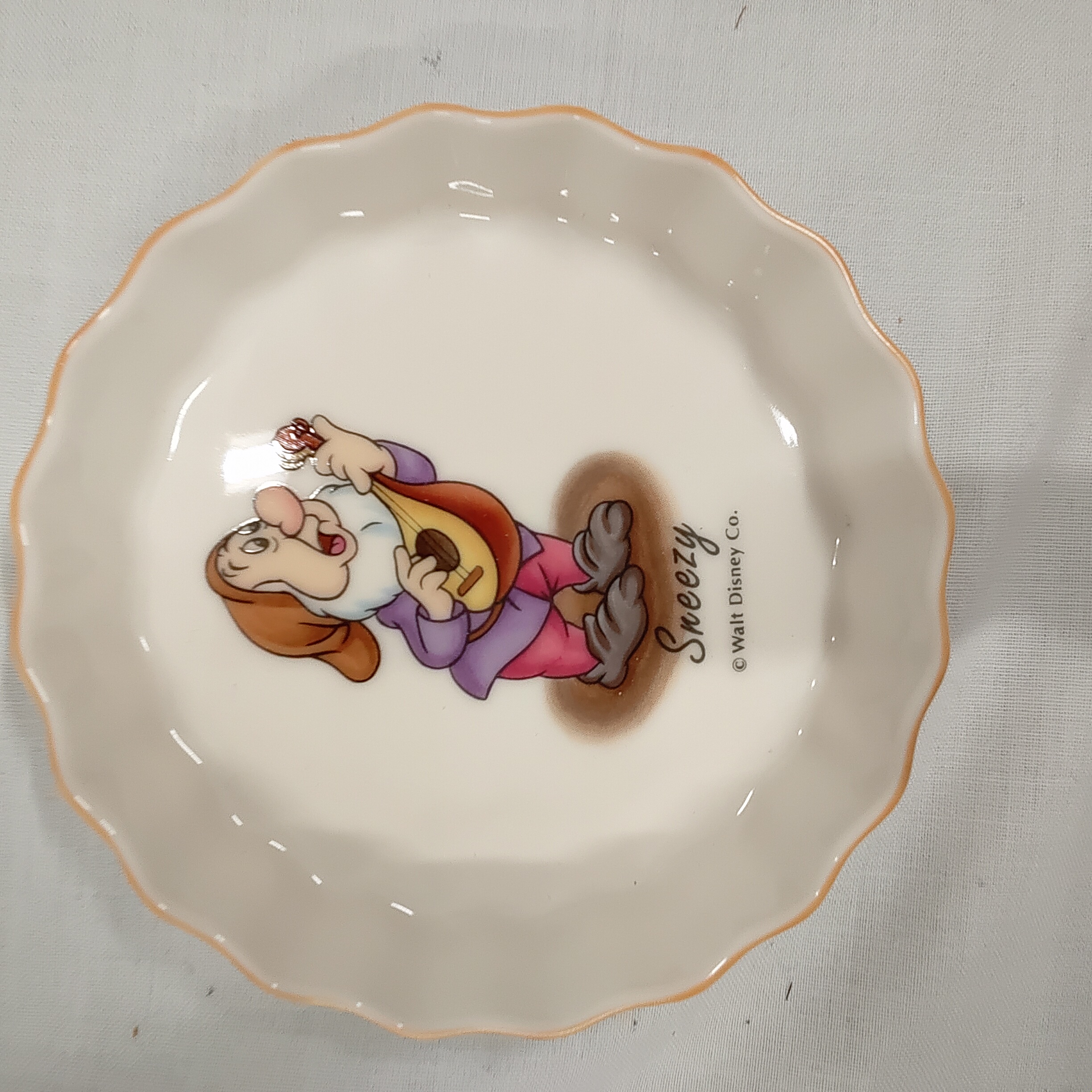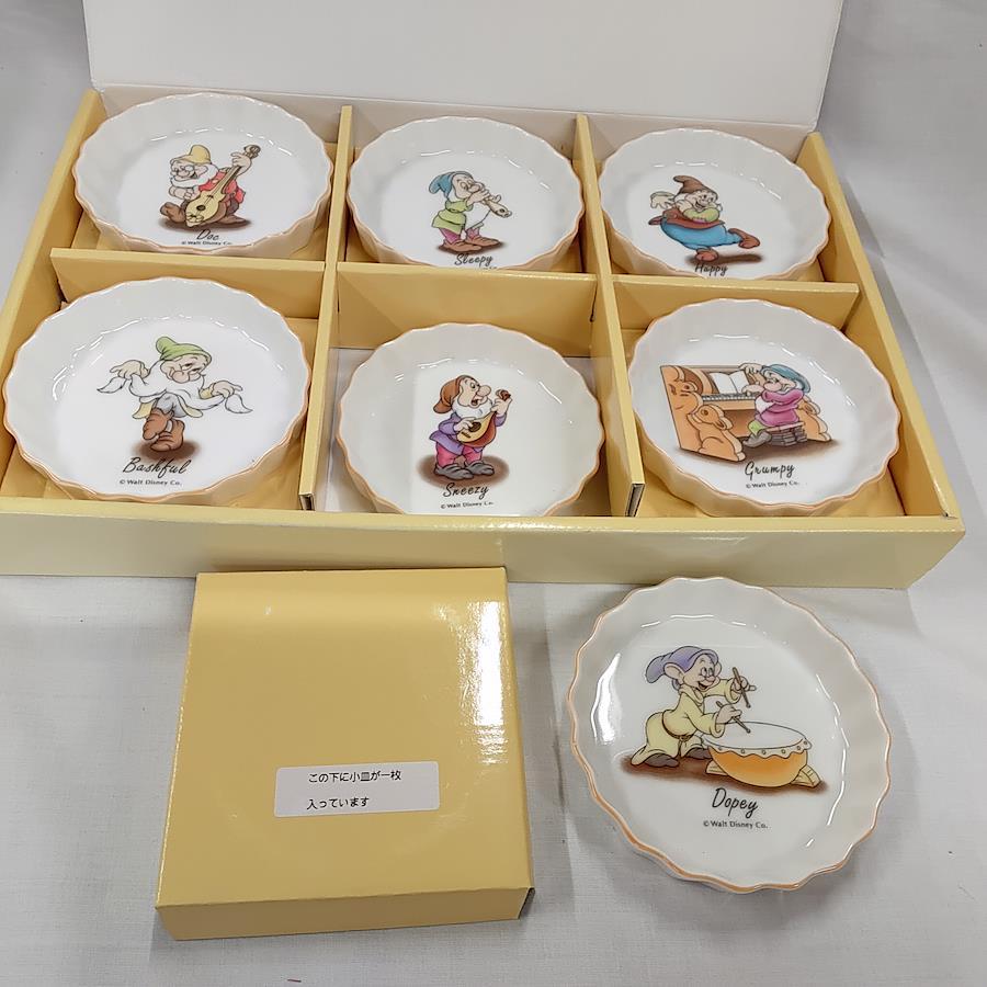 新品未使用7人の小人がそれぞれ1枚づつに描かれた、かわいい小皿です。外箱には経年劣化がありますが、中の小皿は美品です。