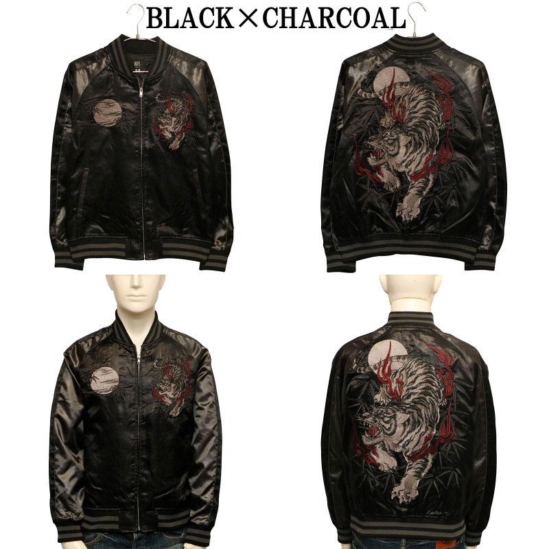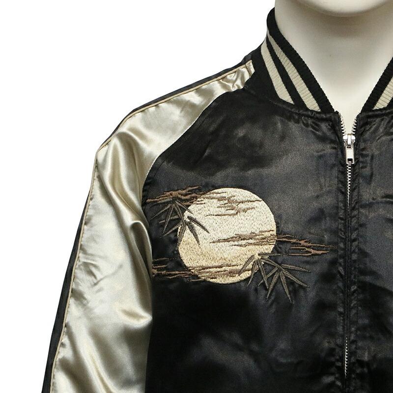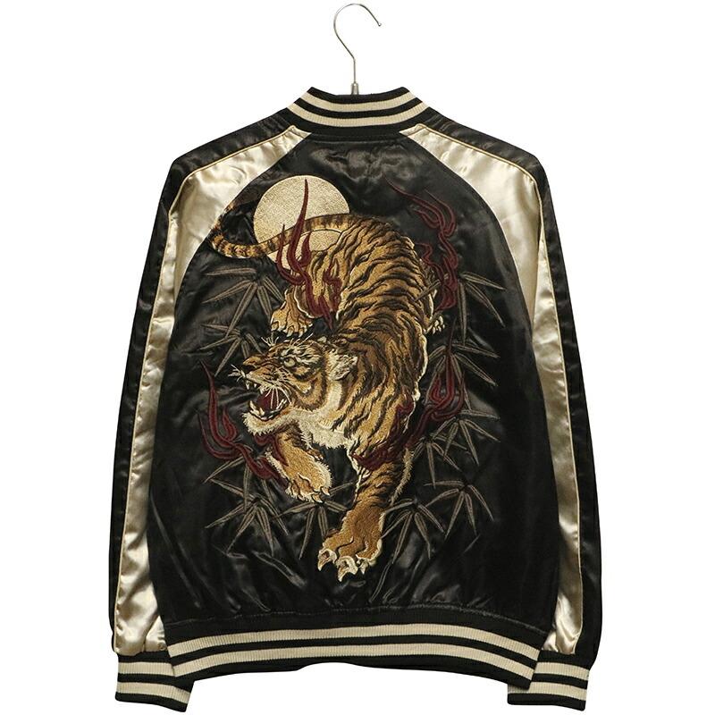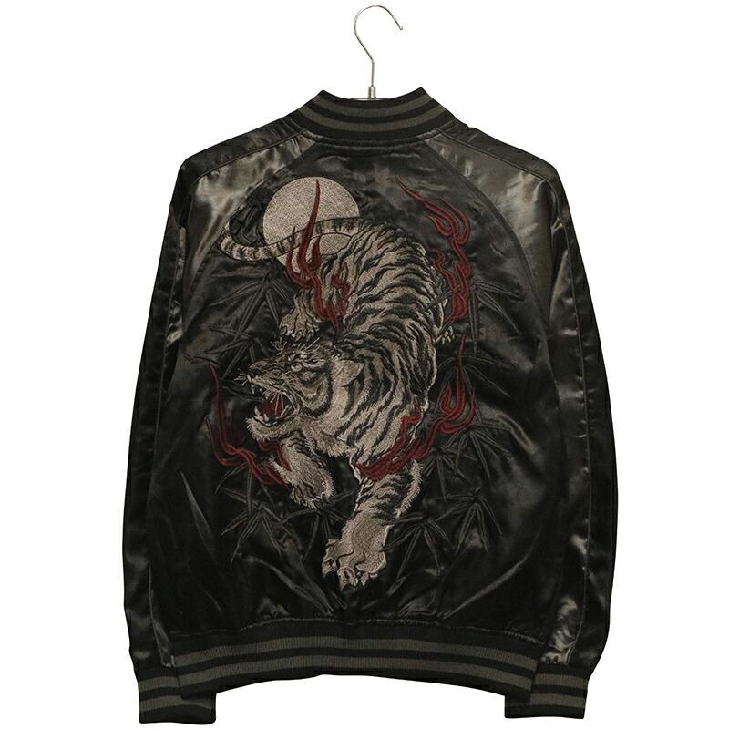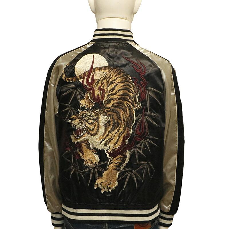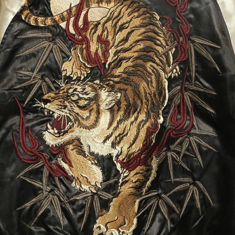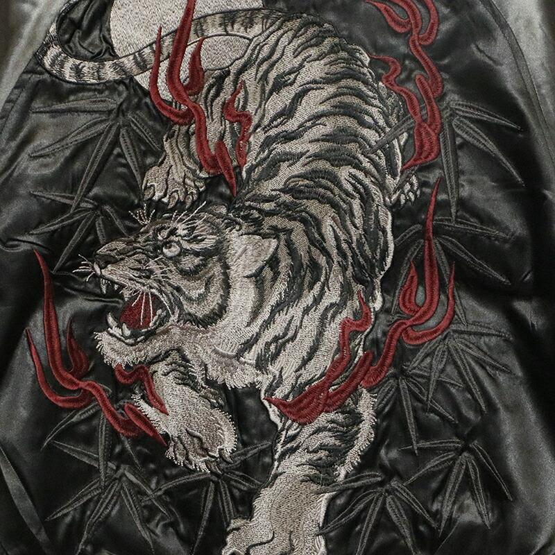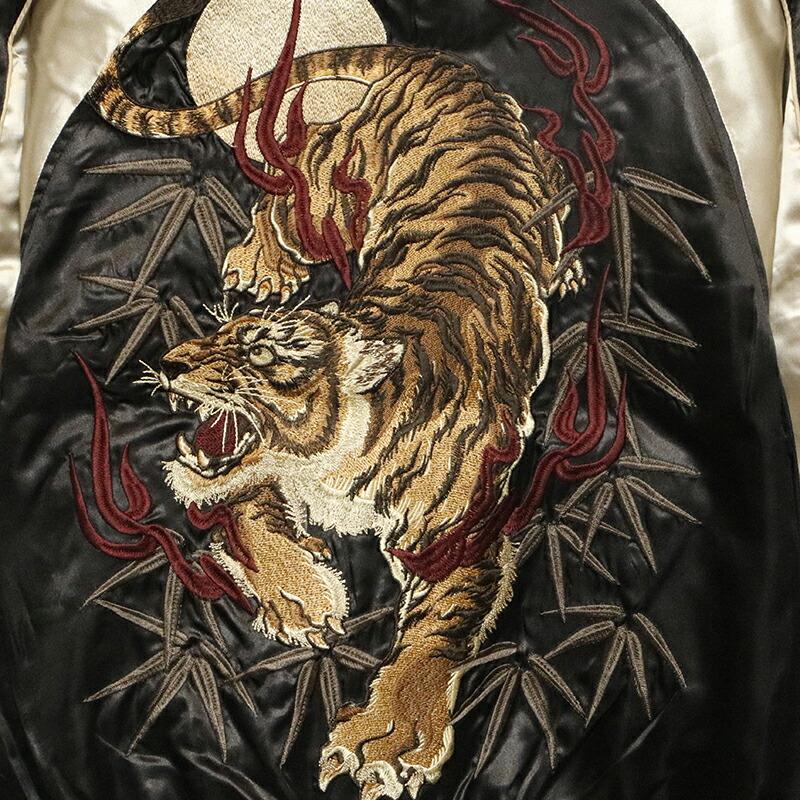 満月の夜に笹薮から獰猛な猛虎が現れる姿を迫力ある構図で刺繍した和柄スカジャン。