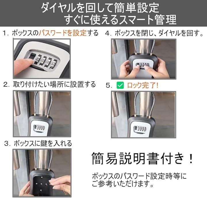 「業務用鍵管理ツール」防水・防錆仕様のキーボックスは、堅牢なアルミ合金とABS樹脂を採用したダイヤル式鍵付きボックスで、玄関や倉庫の鍵入れケースとして個人の自宅やガレージでの鍵管理に役立つのはもちろん、不動産業での物件内見時の鍵管理や建設業での現場事務所や工事車両の鍵保管、清掃業での部屋や倉庫の鍵管理、ビル管理業での巡回ルートの鍵管理など法人企業でも幅広く活用され、ドアノブやフェンス、壁掛けなど設置場所を選ばず工具不要で簡単に設置できるうえ、屋外での使用にも耐える高耐久設計により雨風にさらされる過酷な環境でも錆びにくく、4桁の暗証番号で鍵をしっかり保護できるため複数人での共有や受け渡しもスムーズになり、業務の効率化にも貢献する鍵付き収納ボックスです。