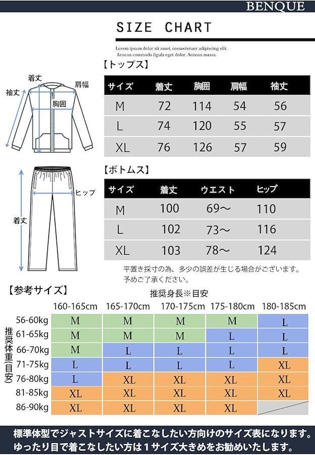 *サイズ:M,L,XL 「トップス」 着丈 /胸囲 /肩幅 /袖丈 [M] : 72 / 114 / 54 / 56 [L] : 74 / 120 / 55 / 57 [XL] :76 / 126 / 57 / 59 「ボトムス」 着丈 /ウエスト(ゴム) /ヒップ [M] : 100 / 69~ / 110 [L] : 102 / 73~ / 116 [XL] :103 / 78~ / 124