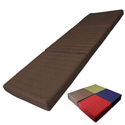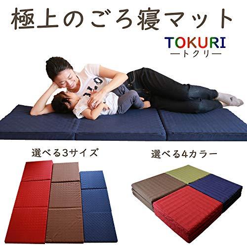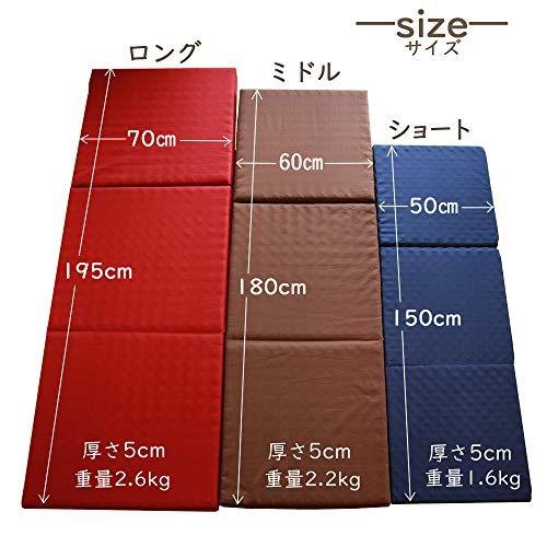 三つ折り構造で畳めば厚手でしっかりした座布団に、広げればみんなで使える長座布団、手軽にお昼寝できるごろ寝マットとして、毎日の生活で活躍するアイテムです。持ち運びができるように厚さ5cmで薄さと軽さのポイントを抑えながら寝心地に最大限こだわりました。高密度のウレタンを使用しています。特殊な3D立体加工をすることで、厚さ5㎝という薄さを感じさせない、しっかりした寝心地をキープしながら上の部分だけ適度に沈みこんで体のラインにフィット。快適な寝心地をつくります。選べる3サイズ ・ショート 50cm×150cm×5cm 重量1.6kg 一番コンパクトで使いやすいサイズ。 ・ミドル 60cm×180cm×5cm 重量2.2kg 少し大きめの座布団としても使えて、広げれば180cmあるのでお昼寝マットとしても大活躍のオールラウンドサイズ。 ・ロング 70cm×195cm×5cm 重量2.6kg 座布団としては大きすぎるサイズです。コンパクトなマットとして選ばれています。通常の敷き布団と比べて全然場所をとらないので、災害用や来客用のマットとして。軽量ノートPC並みの軽さで収納・持ち運びが簡単♪選べる4カラー ブラウン・ワイン・ネイビー・グリーン。側生地:綿100%。ポリエステル生地の方が安価ですが、静電気が起こりやすく使い心地が悪くなります。特殊サイズなのでカバーを使わず直接寝ることを考えて綿100%の生地を採用しました。中のウレタンを取り出せば側生地のみご家庭の洗濯機で洗濯可能です。(※洗濯ネットのご使用をおすすめします。※乾燥機は綿素材のため縮んでしまうので、ご使用しないでください。)携帯用のバッグも無料でついていますので、収納、持ち運びに便利。 ・自宅で座布団や、長座布団、ごろ寝、仮眠できるマットとして。 ・車中泊やアウトドアでも活躍 ・コンパクトで場所をとらない来客用のマット。 ・災害用に備える携帯マット いろんな用途で使用することができます。