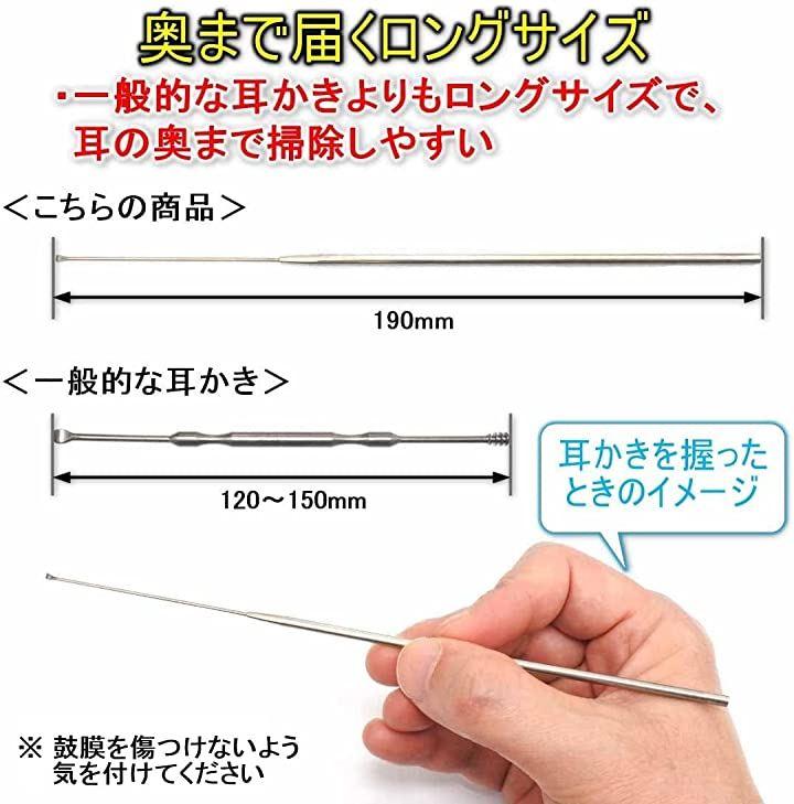 一般的な耳かきの長さは120~150mmとなっておりますが、こちらの耳かきは約190mmとロングサイズとなっております。
