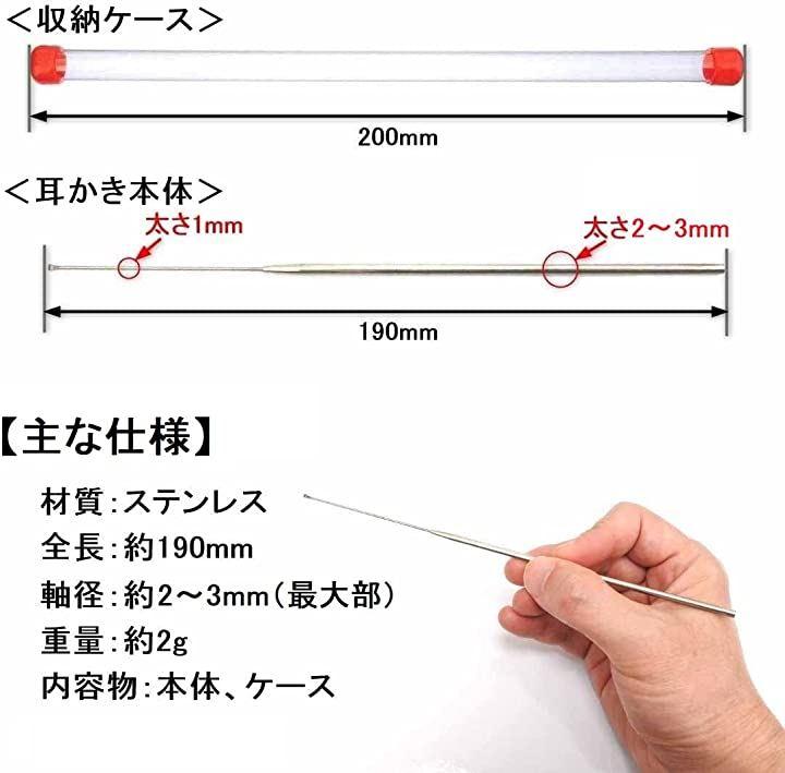 「主な仕様」材質:ステンレス全長:約190mm軸径:約2~3mm(最大部)重量:約2g内容物:耳かき本体、ケース