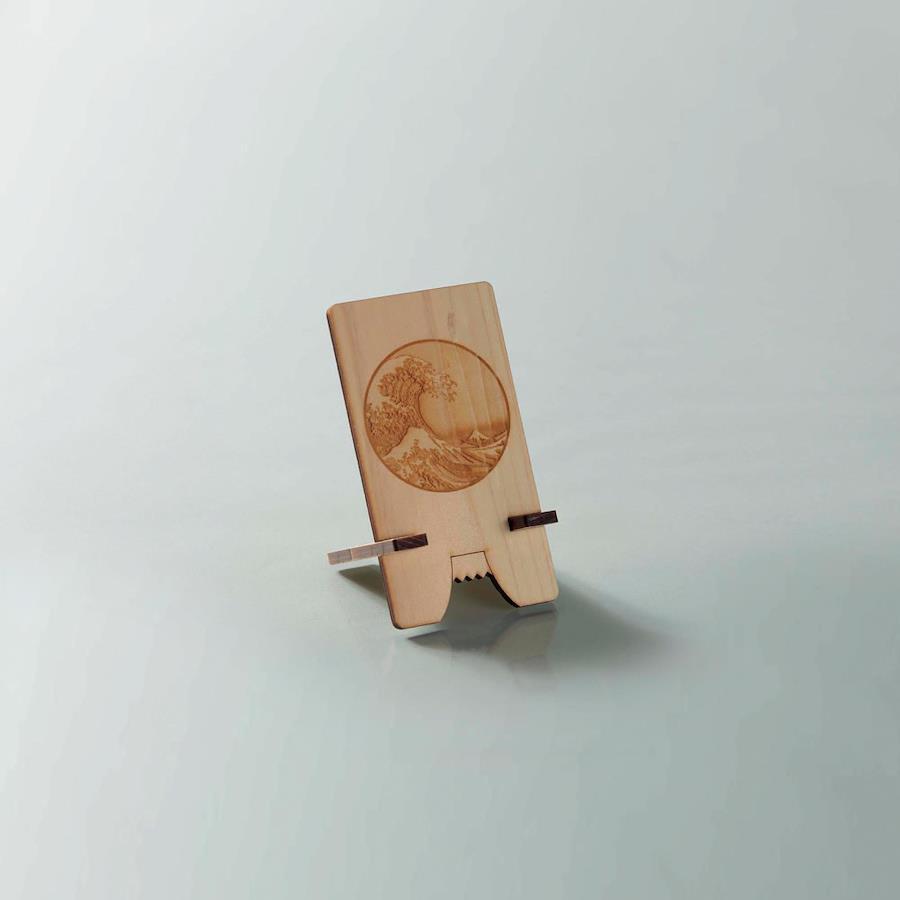 日本産ヒノキ薄板材から作ったスマホスタンドです。2枚の板を組み合わせる事でスマホ置きとして使え持ち運びにも便利です。背のデザインや富士山の形に切り込まれた足元が日本らしくてキュートな一品です。