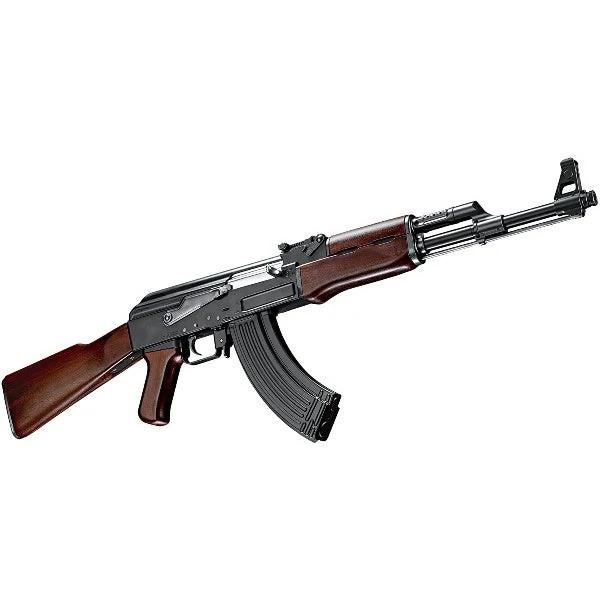 東京マルイ No.24 AK47 TYPE-3 7.62×39mm 18歳以上次世代電動ガン 世界一の生産数を記録する、旧ソビエトのアサルトライフル。トリガーを引くことで発射と同時にボルトが作動し、さらに本体内部で発生した強烈な反動が全身に伝わります。マガジンが空になると発射作動がストップするオートストップシステムを採用。ボルトハンドルを引いてオートストップを解除する、ボルトリリース機構を搭載。フロントサイトは専用のアジャストツールで上下左右に調整が可能。リアサイトはスライドバーの位置を変えるだけでプレート状のサイト本体が持ち上がり、着弾の上下調整が行なえます。銃口のマズルプロテクターを取り外せば、サイレンサーなど14mm逆ネジ仕様のマズルオプションを取り付けることができます。装弾数90発、ホンモノ同様のスチールプレス製アウターケースを採用したマガジンが付属。内蔵式フォロワーストッパー搭載で、マガジンにBB弾を入れずに発射作動だけを楽しむことも可能です。【警告】対象年齢18歳以上