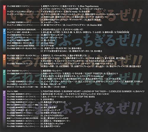 【TRACK LIST】Disc1「いきなりぶっちぎるぜ! ! 」テレビ映画『超電子バイオマン』より01. 超電子バイオマン02. 俺達バイオマン03. Blue Togetherness04. カラフル・バイオマン05. バイオロボの歌06. バイオミック・ソルジャーテレビアニメ『ビデオ戦士レザリオン』より07. ビデオ戦士レザリオン08. We're ready09. 光の世界テレビアニメ『キン肉マン』より10. ベルリンの赤い雨(ブロッケンJr.のテーマ)11. 悪魔の猛牛(バッファローマンのテーマ)12. 地獄の山脈(魔雲天のテーマ)13. 覆面(ルビ:マスク)の狩人(ビッグ・ザ・武道のテーマ)14. 恐怖の回転ドリル(スクリュー・キッドのテーマ)15. 燃えろ! 放送席テレビ映画『宇宙刑事シャイダー』より16. シャイダー・ブルーテレビアニメ『夢戦士ウイングマン』より17. 悪! 裂! ウイングマン18. ショック! ウイングマン19. Desire(欲望)