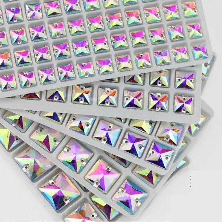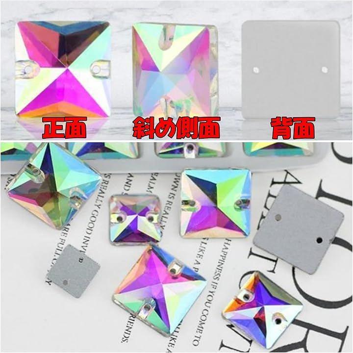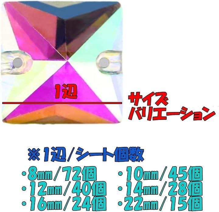 「素材」ガラス「色」AB彩、オーロラ 「タイプ」ソーオン、縫い付け用両端穴2つ「形状」正方形 「販売単位」各サイズ別トレー1つで販売(トレー内の個数はサイズ別