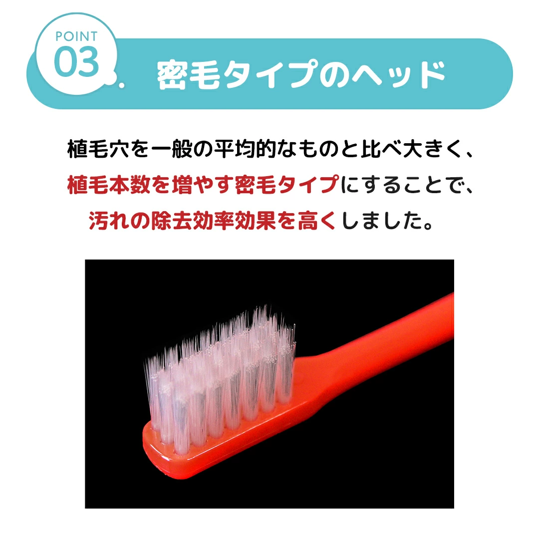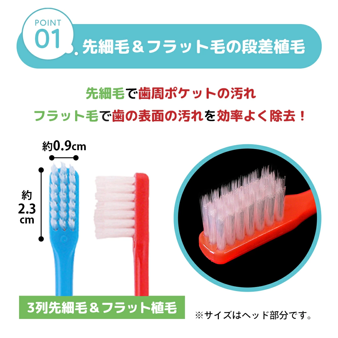 【商品情報】●歯科医監修設計。歯科医と歯科衛生士が効率的で磨きやすい形状に監修設計した歯ブラシ。●3列先細毛&フラット毛の段差植毛。先細毛で歯周ポケットの汚れ、フラット毛で歯の表面の汚れを効率よく除去。●21穴コンパクトヘッド。コンパクトヘッドで奥歯や奥歯の裏側までしっかりと磨け、口腔内のコントロールがしやすくなりました。●タフト(植毛穴)が一般の平均的なものと比べ大きい密毛タイプ。一般的な歯ブラシと比較(メーカー比較)しても約10%増毛となっているため、汚れの除去効率効果がUP。