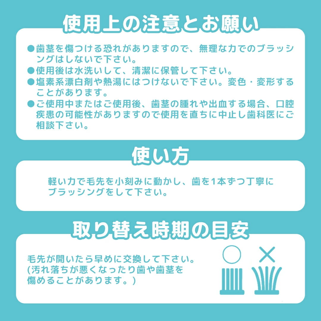 【使用上の注意とお願い】●歯茎を傷つける恐れがありますので、無理な力でのブラッシングはしないで下さい。●使用後は水洗いして、清潔に保管してください。●塩素系漂白剤や熱湯にはつけないで下さい。変色・変形することがあります。●ご使用中またはご使用後、歯茎の腫れや出血する場合、口腔疾患の可能性がありますので使用を直ちに中止し歯科医にご相談下さい。
