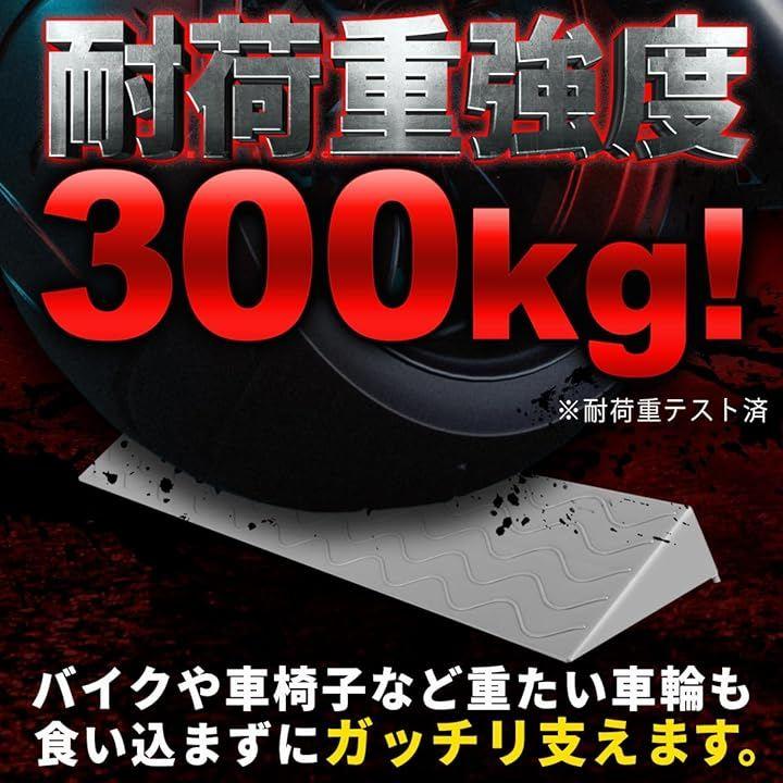 「耐荷重強度300kg.(耐荷重テスト済)」バイクや車椅子など重たい車輪も食い込まずにガッチリ支えます。