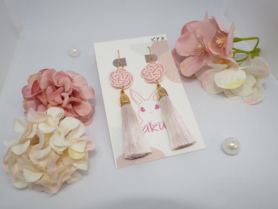 シルクの糸を染料で染めてタッセルにし、ピンク系の水引とあわせましたピアスでございます。可愛らしい上品な存在感がある仕上がりになりました。ハンドメイドの為、一点物となります。
