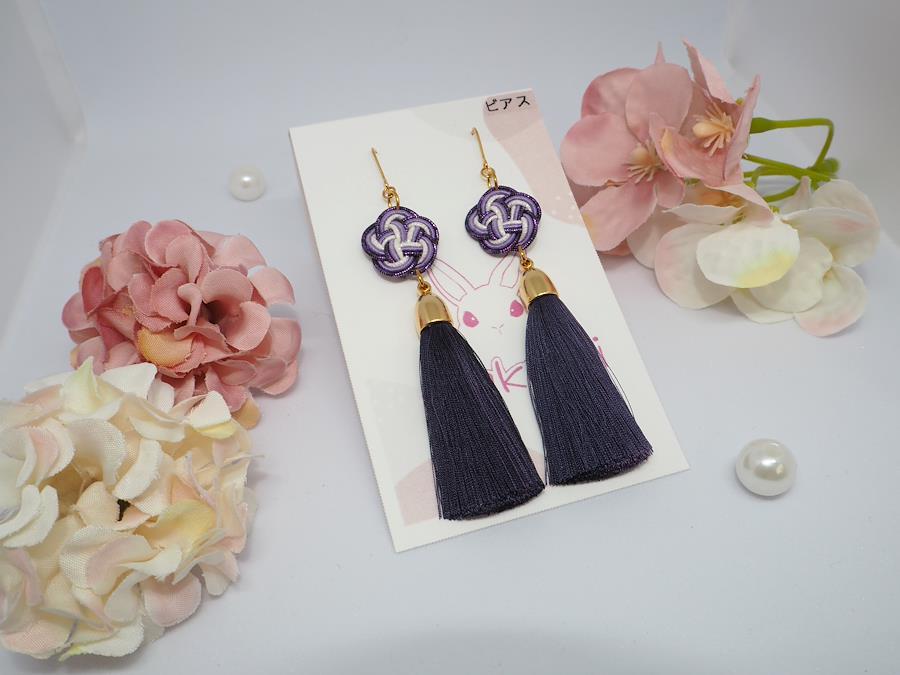 シルクの糸を染料で染めてタッセルにし、紫系の水引とあわせましたピアスでございます。可愛らしい上品な存在感がある仕上がりになりました。ハンドメイドの為、一点物となります。