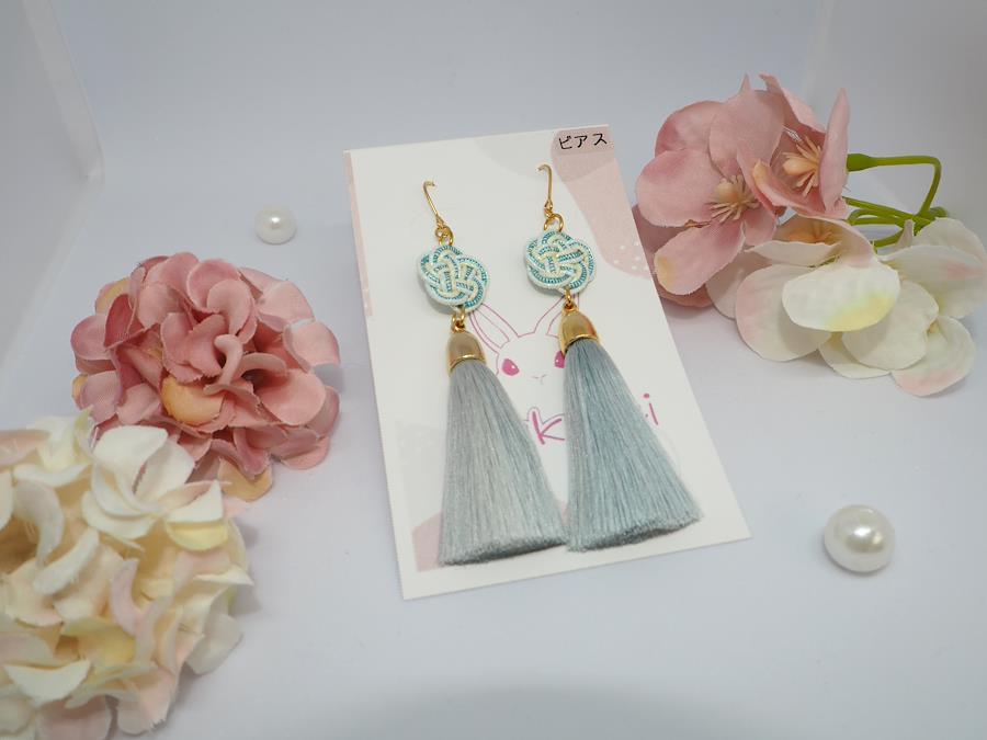 シルクの糸を染料で染めてタッセルにし、水色系の水引とあわせましたピアスでございます。可愛らしい上品な存在感がある仕上がりになりました。ハンドメイドの為、一点物となります。