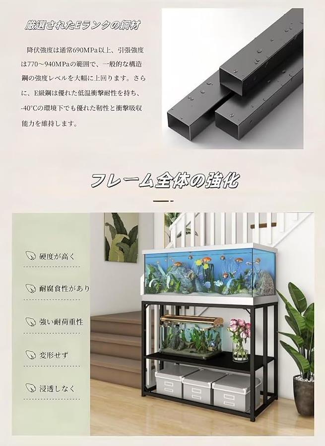 この水槽台は、機能的でありながら美しいデザインと優れた実用性を兼ね備えたアイテムで、あなたの生活空間をさらに快適で整理整頓された環境にしてくれるでしょう。