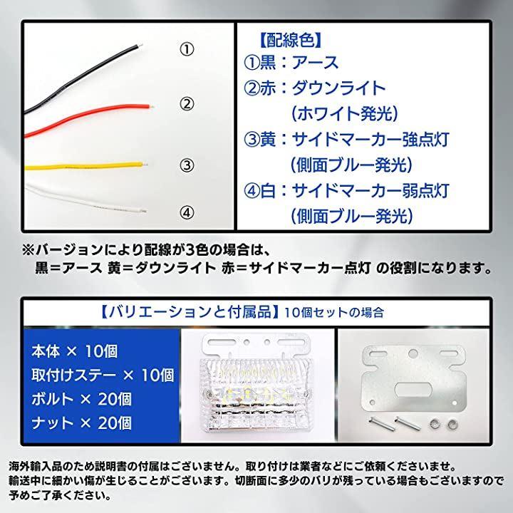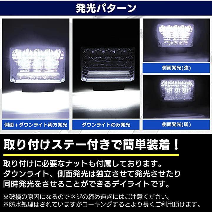 ・「配線」 黒=アース 赤=ダウンライト (ホワイト) 白=弱点灯 (ブルー) 黄=強点灯 (ブルー) ダウンライト、 側面発光は独立させて発光させたり同時発光をさせることができます。 *配線が3色の場合は、黒=アース、黄=ダウンライト、赤=サイドマーカー、になります。