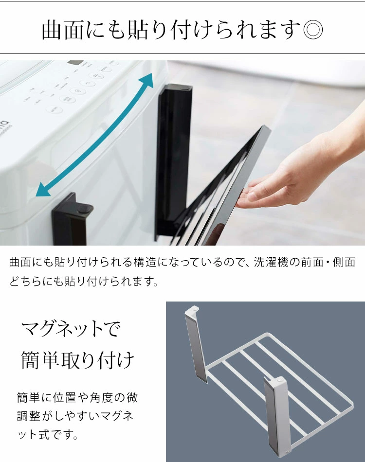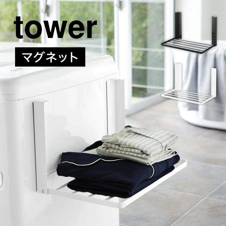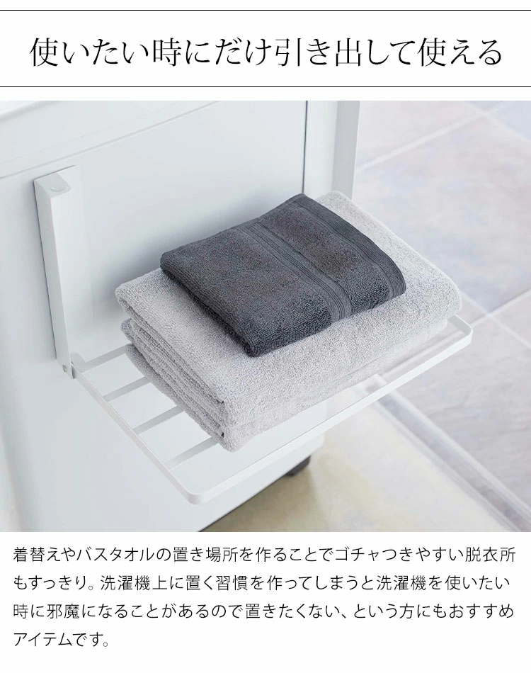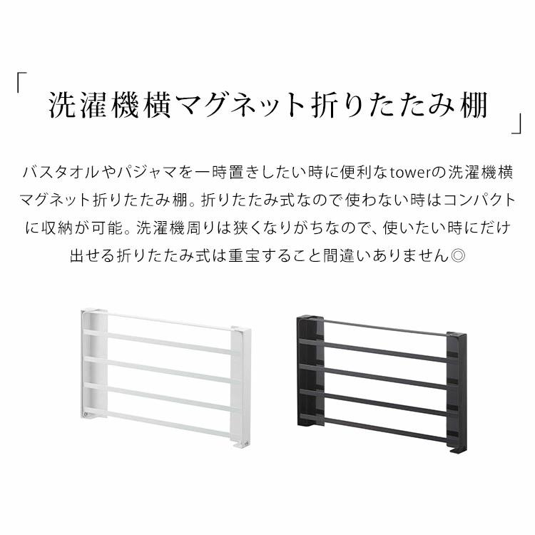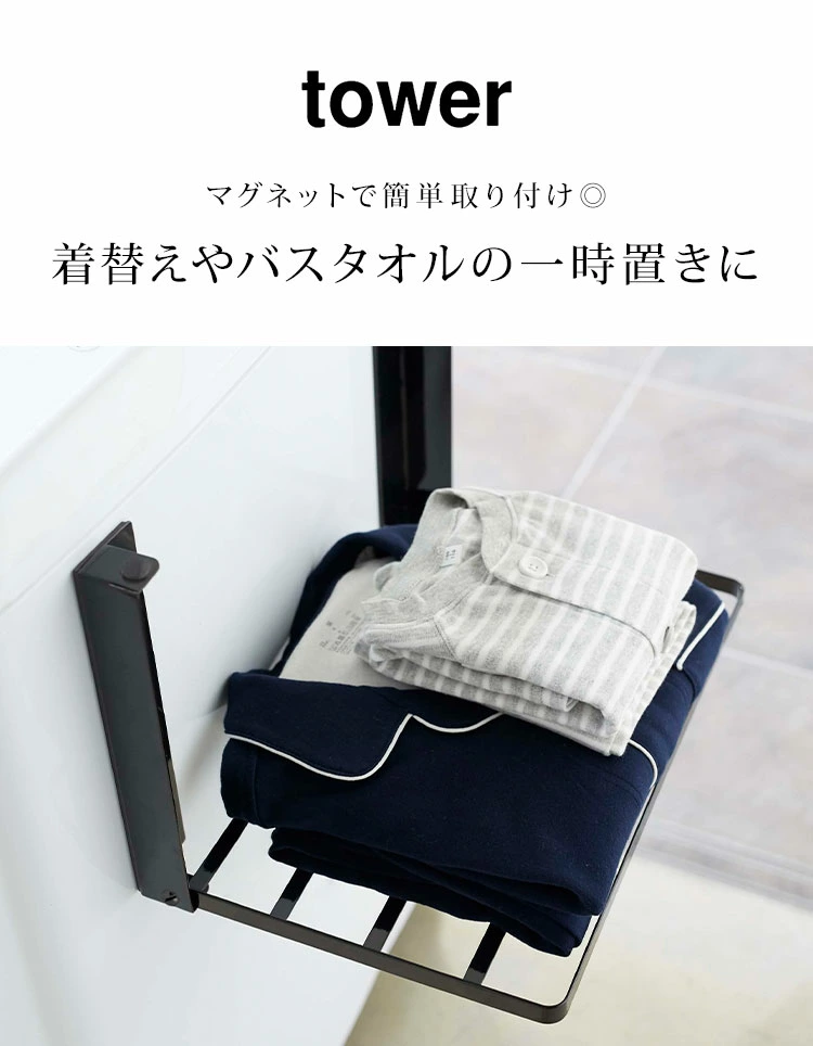 【洗濯機横マグネット折り畳み棚】バスタオルやパジャマを一時置きしたい時に便利なtowerの洗濯機横マグネット折りたたみ棚。折りたたみ式なので使わない時はコンパクトに収納が可能。洗濯機周りは狭くなりがちなので、使いたい時にだけ出せる折りたたみ式は重宝すること間違いありません◎