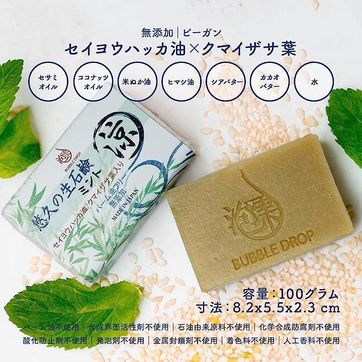 成分:水、コメヌカ油、ヤシ油、水酸化Na、ゴマ油、ヒマシ油、シア脂、カカオ脂、クマイザサ葉、セイヨウハッカ油