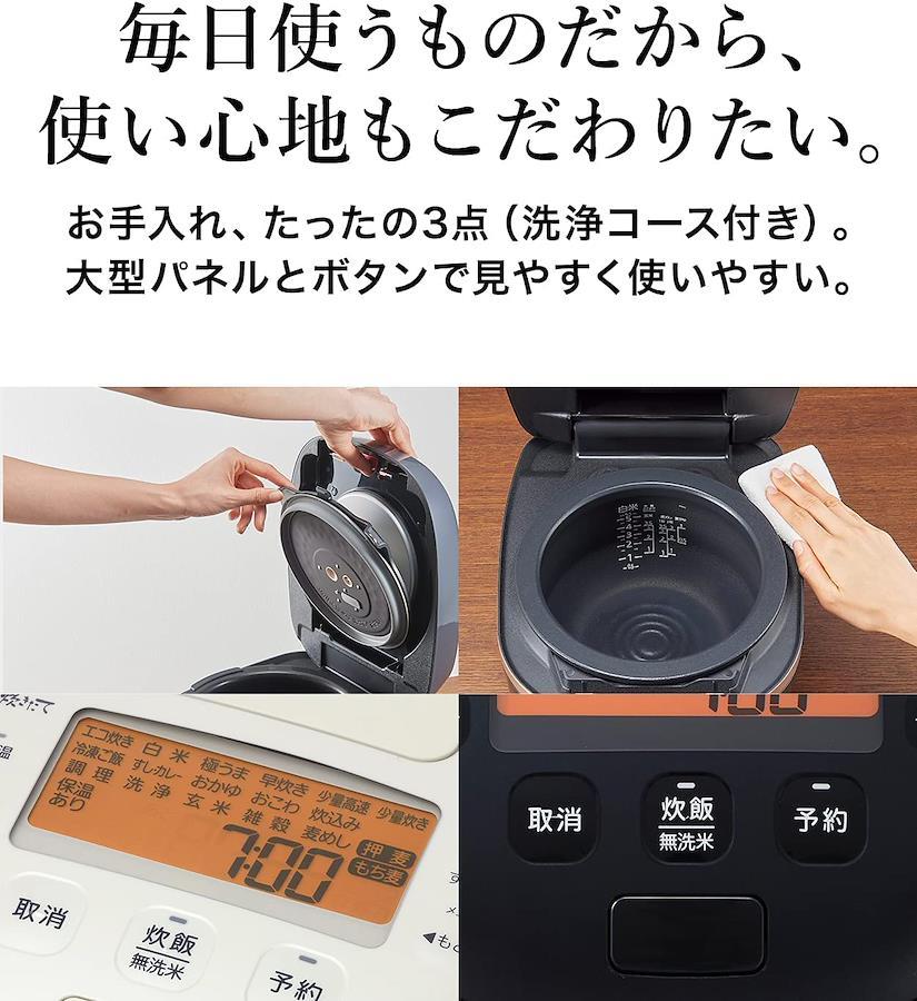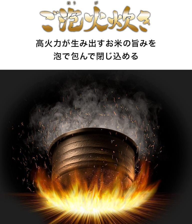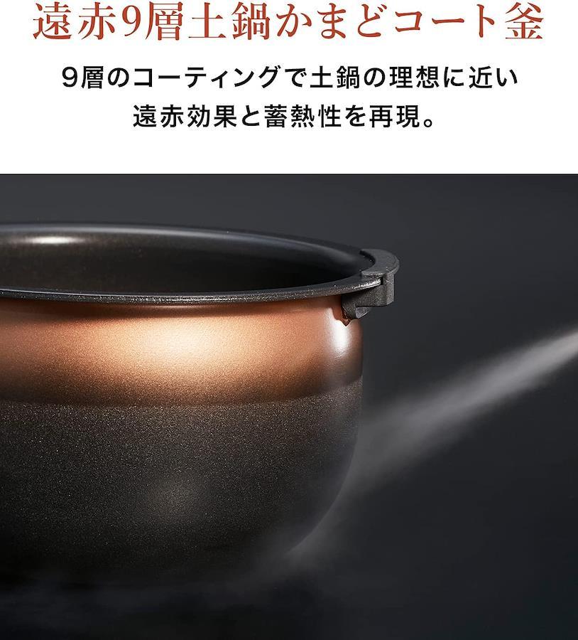 炊飯容量:5.5合炊き(0.09~1.0L) / 加熱方式:圧力IH / 無洗米炊飯可能 ・商品サイズ本体:(約)幅25.2×奥行30.2×高さ21.1㎝ 本体質量:約5.4kg ・保証期間:1年(内なべ3年保証)「遠赤9層土鍋かまどコート釜 ご泡火仕上げ」;内なべ外側には、「土鍋蓄熱コーティング & かまどコーティング」を採用。上部には熱伝導の高い銅素材、下部には蓄熱性の高い土鍋素材のコーティングを施し、土鍋の理想に近い蓄熱性を再現。内なべ内側には「遠赤土鍋コーティング」を施すことで遠赤効果を高め、土鍋で炊いたようなごはんの旨みと甘みを引き出します。約3000個以上の細かな凸により、土鍋のような細やかな泡立ちでの沸とうを実