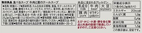 原材料名 : たん白加水分解物、食塩、牛テールエキス、デキストリン、砂糖、酵母エキス、ビーフエキス、ゼラチン、香辛料、具 (牛肉 (オーストラリア) 、ねぎ、乾燥キャベツ、唐辛子、増粘剤 (キサンタンガム) 、酸化防止剤 (V.E) (一部に乳成分、牛肉、大豆、豚肉、ゼラチンを含む)内容量 : 25.2g (6.3g×4食) (1人160mlで4人前)保存方法 : 直射日光・高温多湿の場所を避けて保存賞味期限 : 製造日から365日本品に含まれるアレルゲン : 乳成分、牛肉、大豆、豚肉、ゼラチン【重要】メーカーによる商品リニューアルに伴いパッケージ(内容量も含む)変更が行われた場合、新パッケージでお届け致します事ご了承願います。