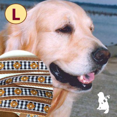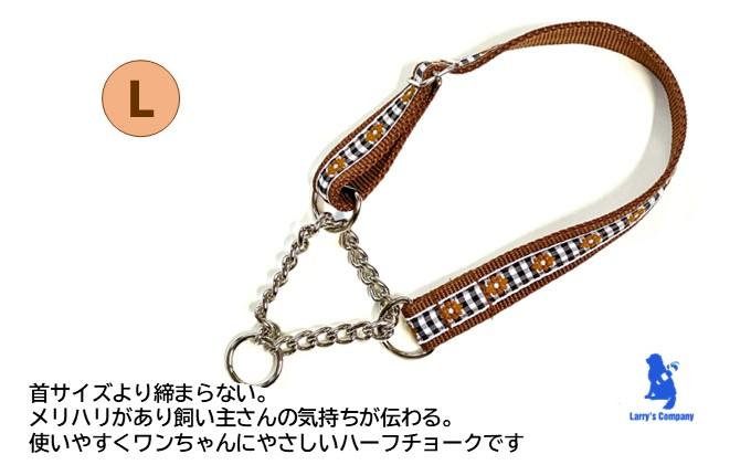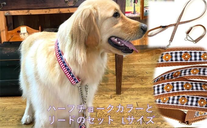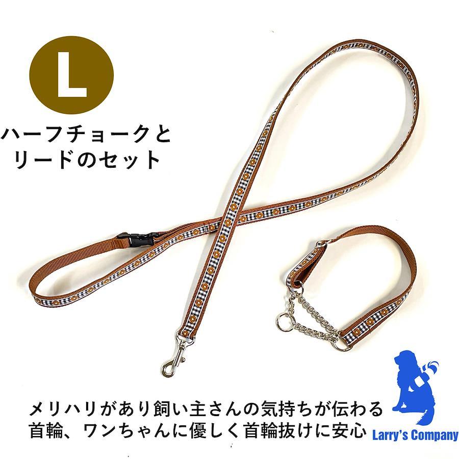 リードとハーフチェックカラーのセットです。【サイズ】L首輪:幅2.5cm調節可能範囲 約30cm~46cm生後3ヶ月位のパピーから成犬になるまで、同じ首輪で調節可能です。首のサイズより締まらないので苦しくなく、引いた時に金具のシャリっとする音で、しつけにも向いています。