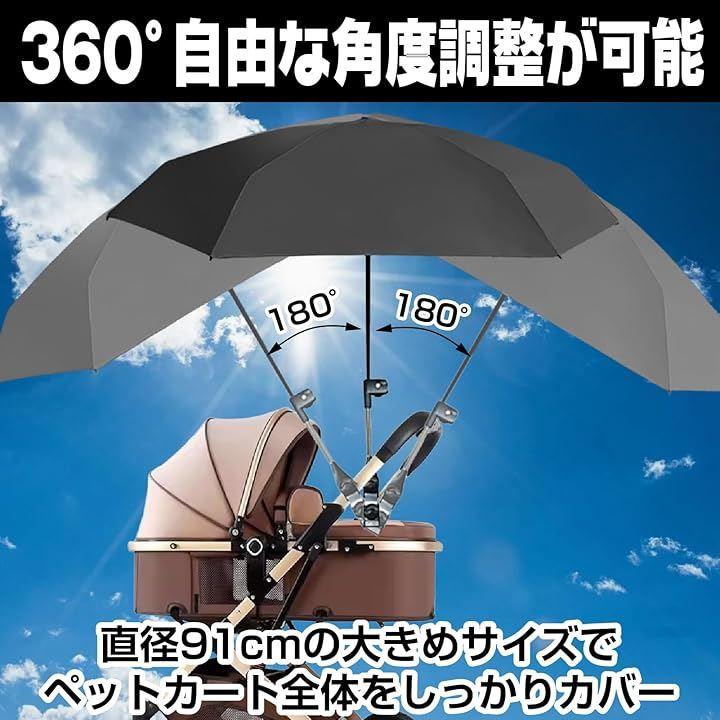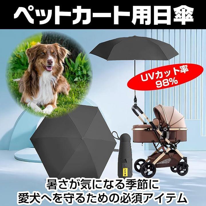 「犬用 ペットカート用 日傘で大切な愛犬を直射日光から守る」 ペットカートに取り付けられる専用日傘で、夏の強い日差しから愛犬をしっかりガード。