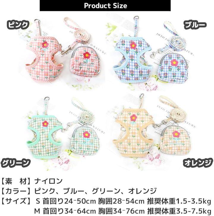 「素材」ナイロン「カラー」ピンク、ブルー、グリーン、オレンジ「サイズ」S 首回り24⁻50cm 胸囲28⁻54cm 推奨体重1.5-3.5kg、M 首回り34⁻64cm 胸囲34⁻76cm 推奨体重3.5-7.5kg