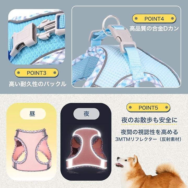通気性に優れたメッシュ素材を使用した犬用ハーネス&リードセットは、軽量で着け心地もやさしく、暑い季節でも快適にお使いいただけます。