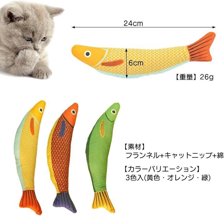 「素材」フランネル+キャットニップ+綿「カラーバリエーション」3色入(黄色、緑、オレンジ)「サイズ」長さ24cm,太さ6cm「重量」26g