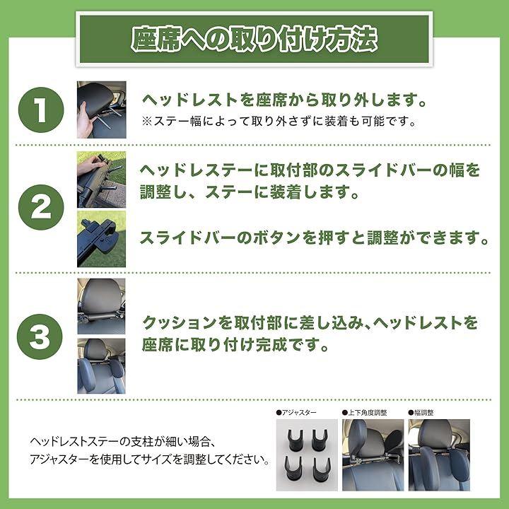 「商品仕様」サイズ:クッションH22xD13xW4cm 材質:PUレザー セット内容:ヘッドレスト取付部x1、クッション部x2、アジャスター2種x2
