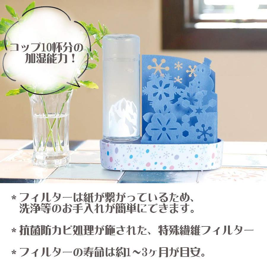 3営業日以内に発送≪新品未開封品≫:電気を使わない自然気化式の加湿器雪花の交換用フィルタ-です。加湿能力はコップ1杯(径52mm)の自然蒸発量の約10倍(温度25℃・湿度35%時の蒸発量)※当社試験による。デザインはクリ-ンな印象の淡い青色のフィルタ-に様々な形状の結晶を散りばめて奥行のある雪の世界感を表現。(材質)フィルタ-:特殊繊維。