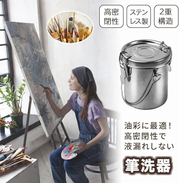 油絵などの筆や刷毛を洗うのに便利な、ふたがしっかり閉まる密閉型のステンレス製筆洗器です。