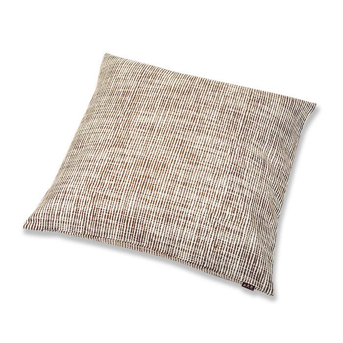江戸時代に庶民の間で持て囃された縞模様は、南蛮貿易によって日本にもたらされました。江戸の庶民は色んな縞模様を創りだし「粋」を楽しんだそうで【千筋】よりも細い縦縞が万入ると言う意味で【万筋(まんすじ)】と名付けられました。自然な白地に筆で描いたようなとても細い焦茶の縞が入り、横糸が白く渡る事で複雑な縞模様を見せます。繊細で落ち着きのある趣がどんな空間にも合うデザインです。生地はざっくりとした織目で、手になじみの良い変わり織りです。【カバーサイズ】 横55cm×縦55cm【生地素材】 綿(変わり織り)100%この商品はカバー(ファスナー加工)のみです。中わたは別途ご購入ください。またカートの購入可能数より多い数をご希望の場合はご相談ください。