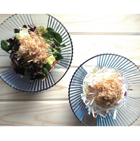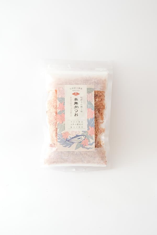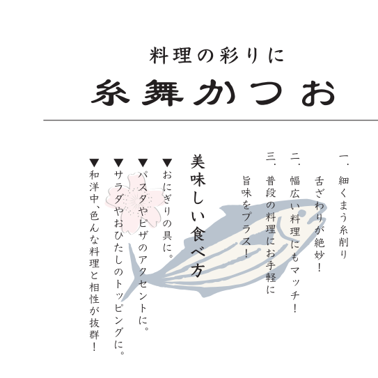 "水揚げ直後の天然生鰹を使用しているため塩味が少なく、蒸さずに削る方式を和歌山県すさみ町にて行う事で、旨みを閉じ込めた削りたての香味をご堪能いただけます。サラダにオススメ!かつおの旨味を舌で”堪能”できるように糸状に削った商品です。華やかに口の中で広がる鰹本来の香りと旨みはお料理のメインとしてもお使いいただけます。また、ダシをとっても全く濁らないと大変ご好評いただいております。料理の腕前もワンランクUP!和歌山県に伝わる「手火山製法」。約30日間燻しと寝かしを繰り返し旨味を熟成させた極上の風味を引き出す秘伝の技を、日本の職人が現地スタッフに指導して製造しております。