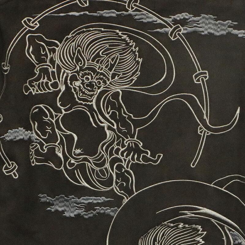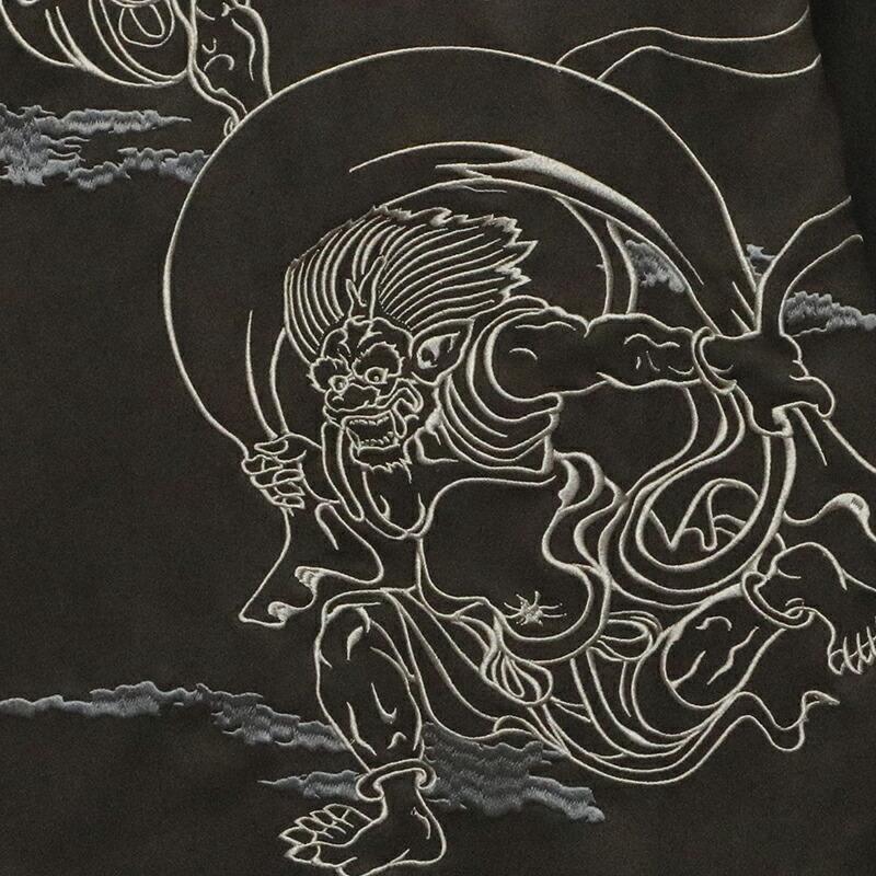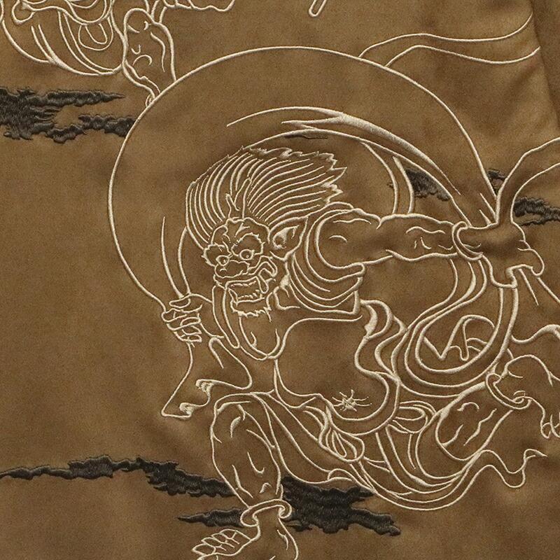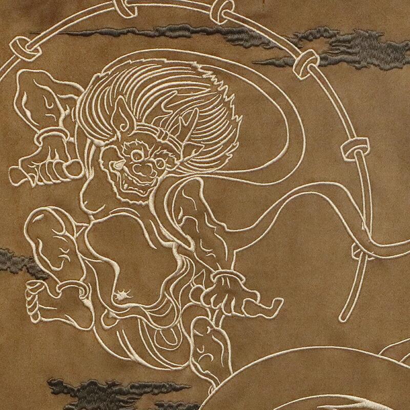 柄には和柄の風神雷神を対峙する構図で刺繍で落とし込みました。